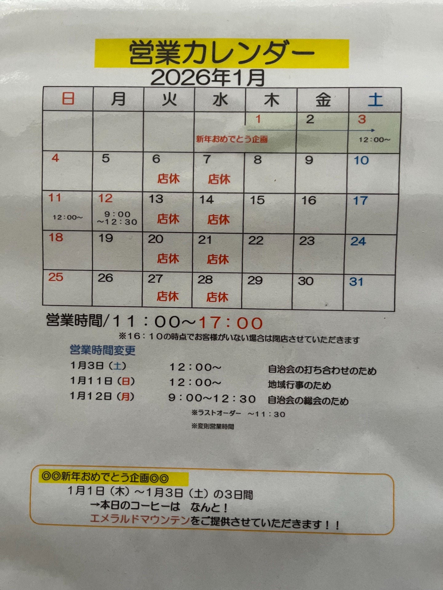 さて、1月ですが、何かと自治会の仕事があり、営業時間の変更があります。