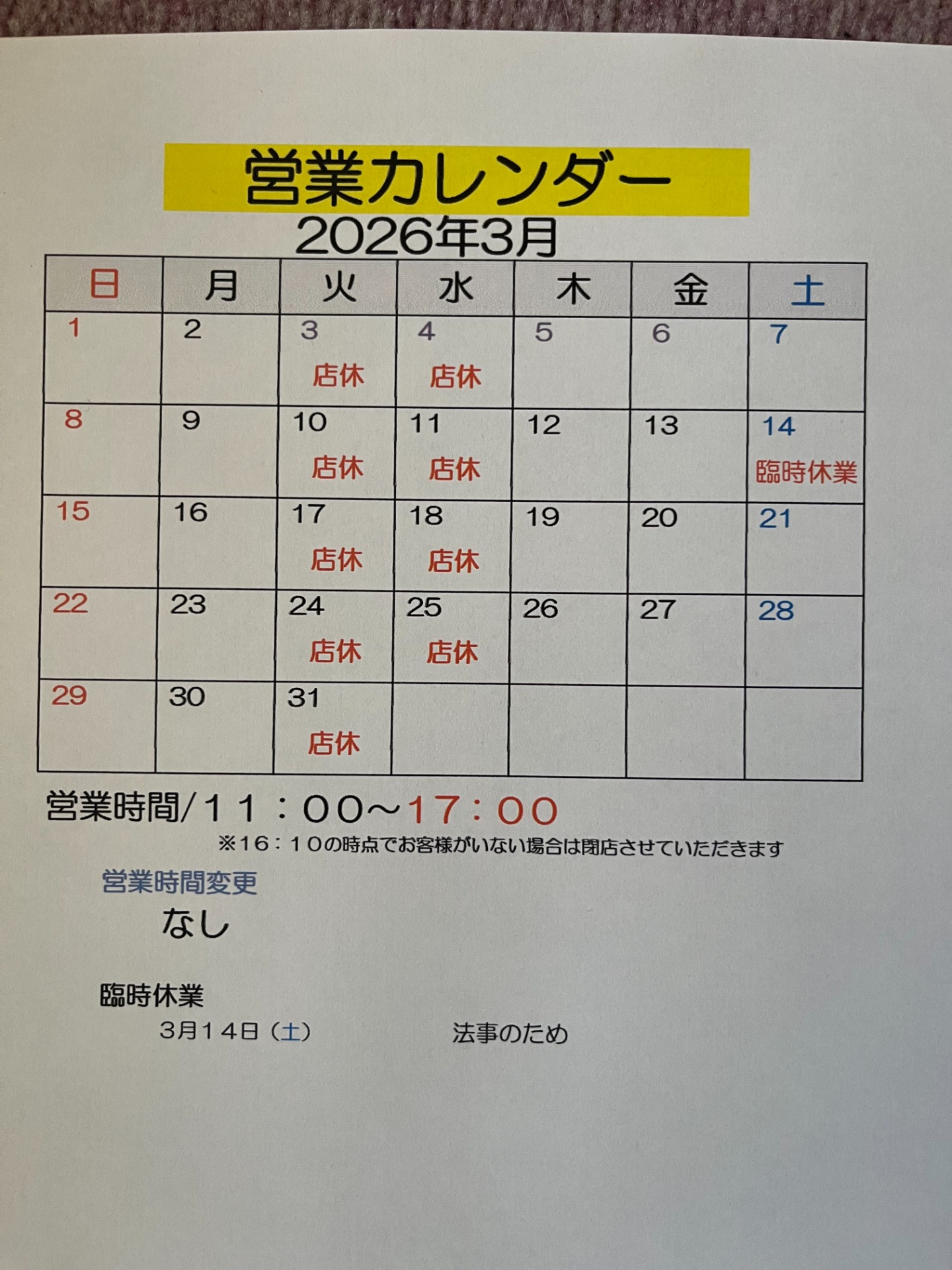 3月は臨時休業を取らせていただく以外は、特に変更はございません。